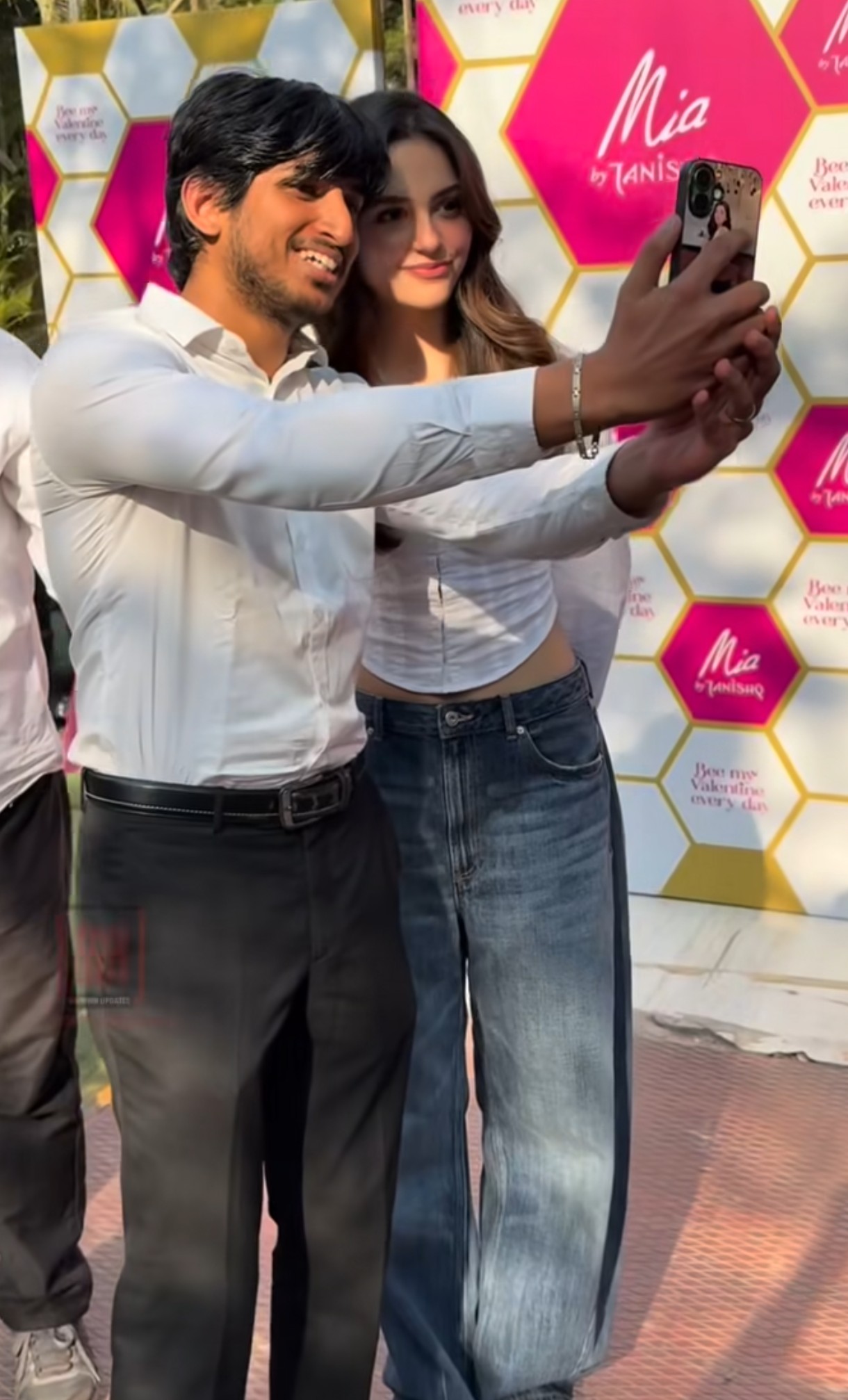 Aneet wears a sophisticated berry-toned square-neck top, serving as the perfect backdrop for a layered Mia by Tanishq necklace. The look features a delicate gold chain paired with a floral-motif choker and a dainty star-drop earring, emphasizing modern femininity.